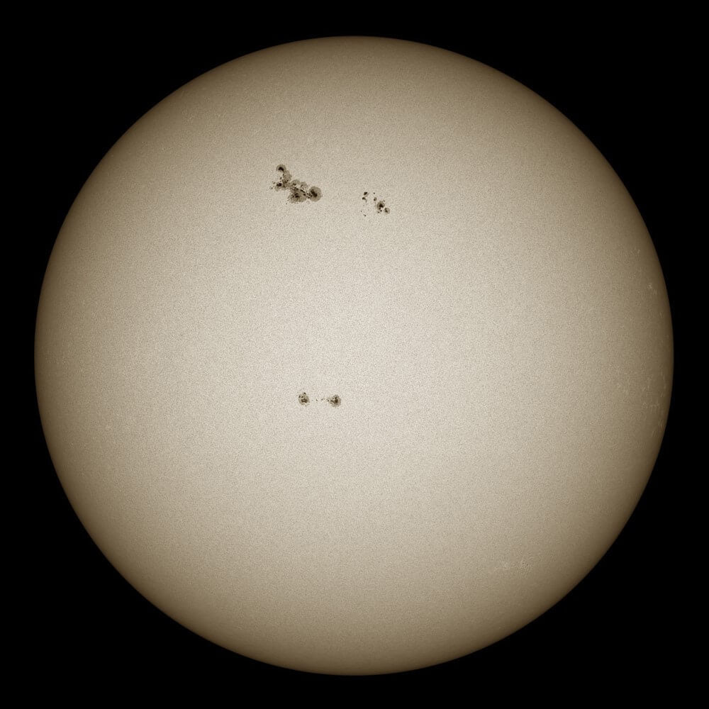 Through white light viewing, you’ll see sunspots, faculae and granulation. You’ll be able to see the umbra, the dark core of sunspots, and the penumbra, the hotter surrounding region. Faculae are hot areas and granulation are 1000-mile-wide plasma bubbles that last 10-20 minutes.