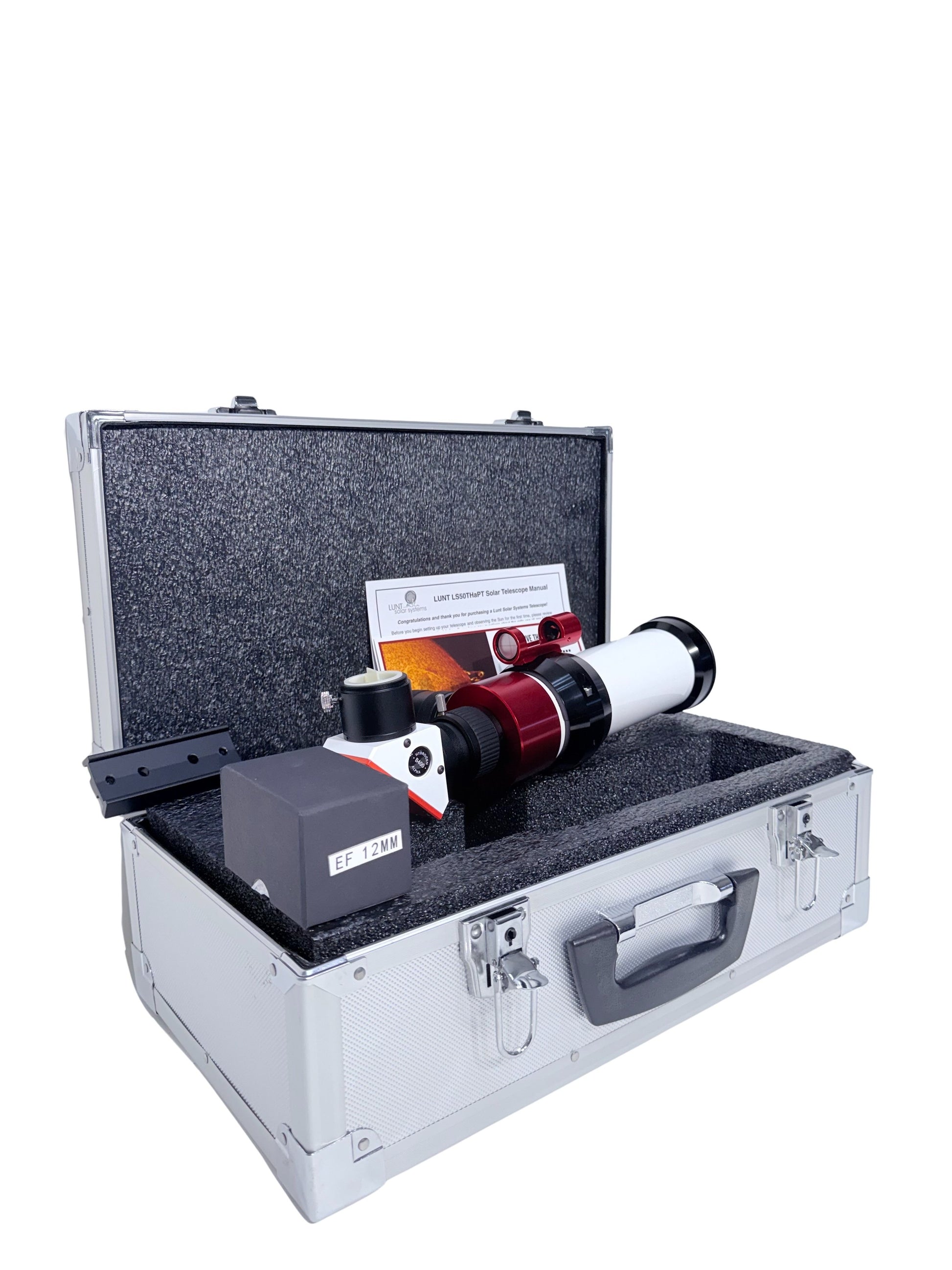At just over 3 pounds with a 350mm f/7 optical system, the LS50THa travels effortlessly. The integrated clamshell mounting base accepts the included Vixen dovetail for any compatible mount, or sits securely on a photo tripod. The SunLock red dot finder gets you on-target safely in seconds. The 12mm flat-field eyepiece, coated with the same 0.1% AR coatings we use on our etalons, provides 29x magnification for detailed views of surface activity and limb prominences.
